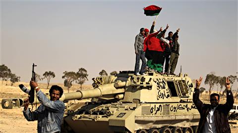 Photo: AFP/Patrick Baz Des rebelles lybiens célèbrent sur un tank détruit dans la ville d'Ajbadiya. |